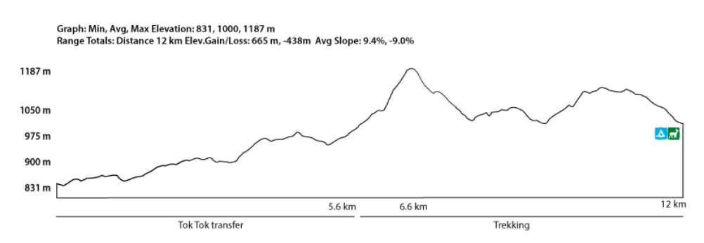 (เดินป่า 7.5 กม. + รถแทรกเตอร์ท้องถิ่น 5 กม. เดินป่า 4 ชั่วโมง + รถแทรกเตอร์ 1 ชม. ระดับความสูงขึ้น/ลง +420 ม./-460 ม. ความชันเฉลี่ย +10%/-11%)